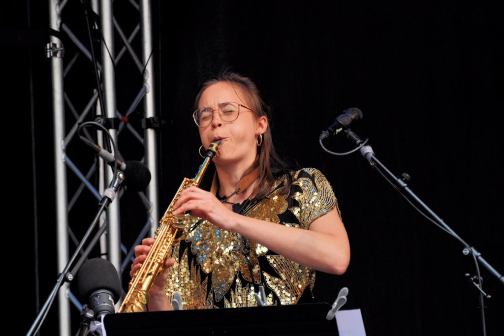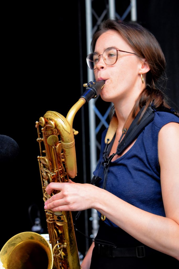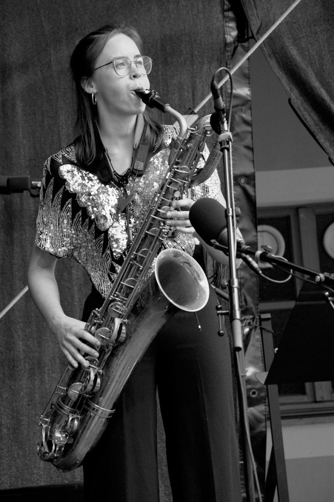 An Sopran- und Baritonsaxophon zeigte sich Victoria Pfeil experimentierfreudig, mit sichbarer Begeisterung dafür, in hohen wie tiefen Lagen die Kommunikation auf der Bühne zu bereichern.